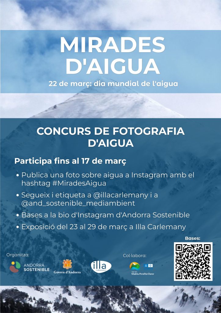 Andorra Sostenible posa en marxa el concurs de fotografia Mirades d’aigua – Andorra 2026 amb motiu del Dia Mundial de l’Aigua, amb l’objectiu de sensibilitzar la ciutadania sobre el valor ambiental, social i territorial d’aquest recurs essencial al nostre país. La iniciativa està organitzada conjuntament amb Illa Carlemany i compta amb la col·laboració de la Vall del Madriu-Perafita-Claror.